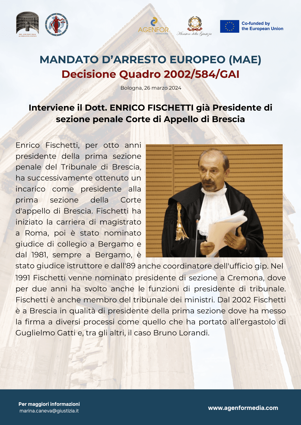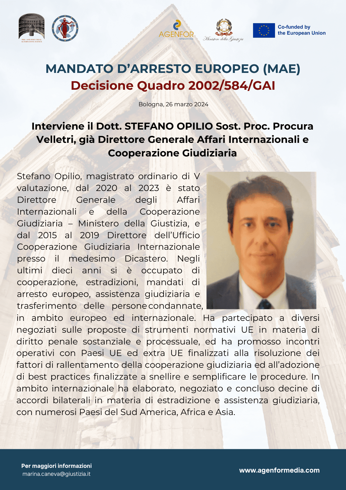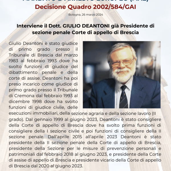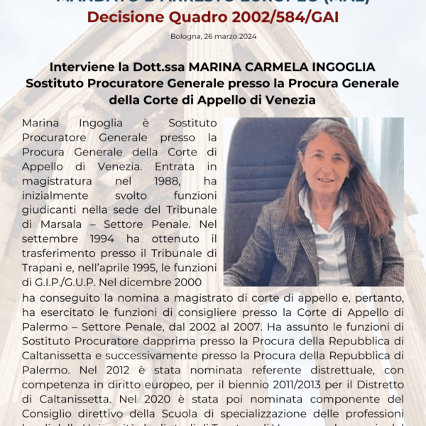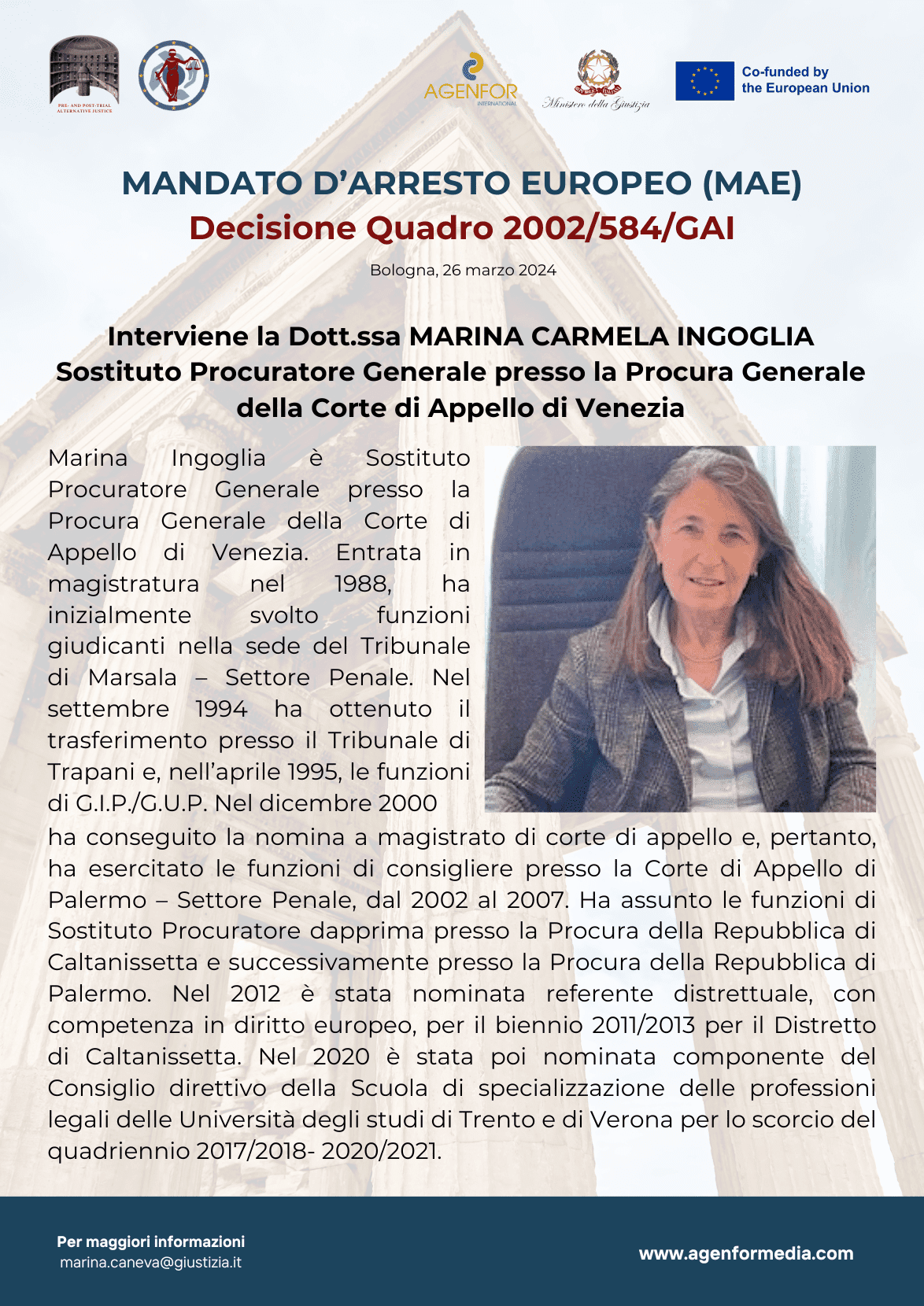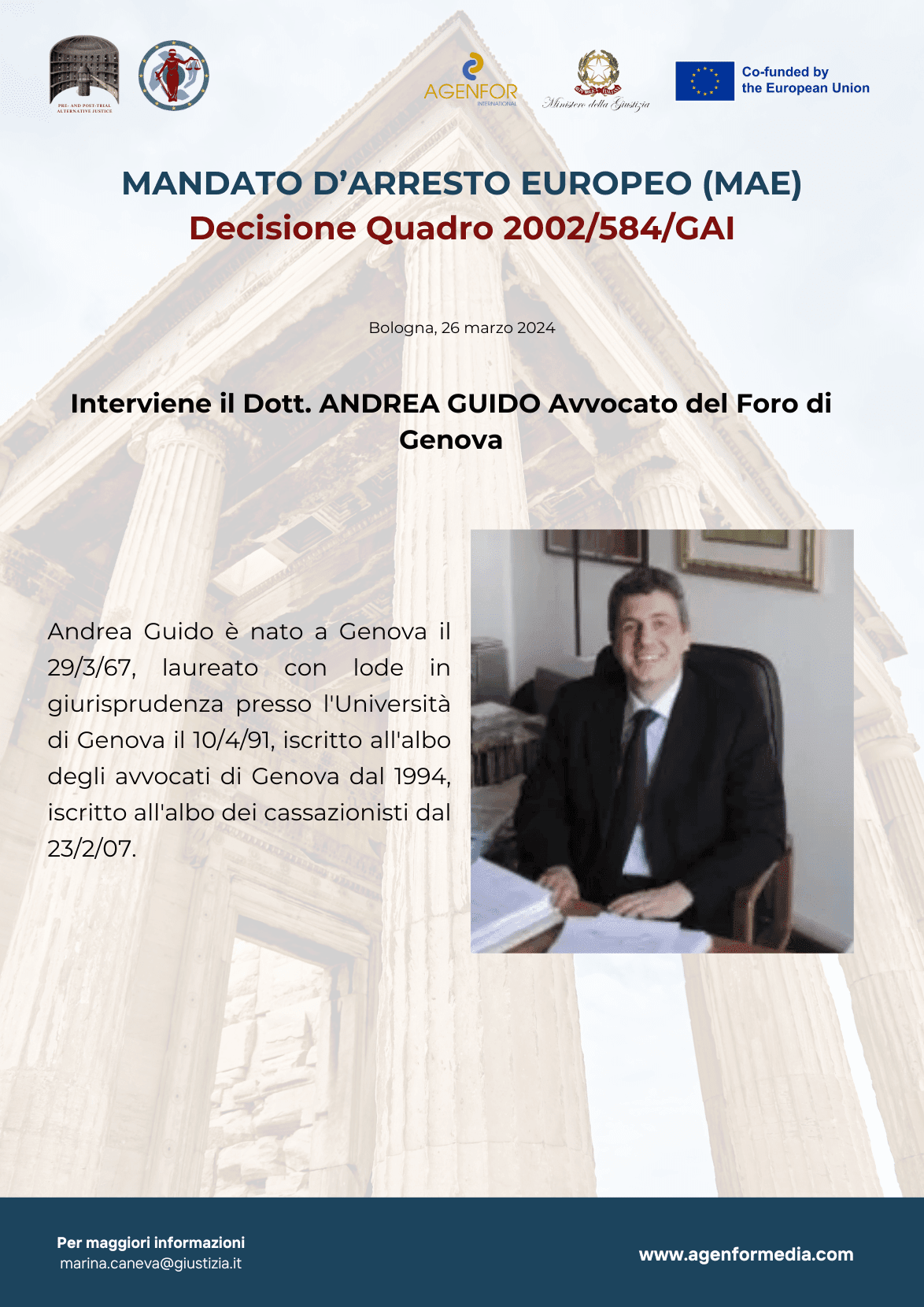 Corso di Formazione di Eccellenza Mandato d’arresto europeo (MAE), Decisione Quadro 2002/584/GAI – Nodi critici, aspetti giurisprudenziali nazionali e sovranazionali nelle procedure attive e passive. Il MAE alla luce della Stockholm’s Roadmap (Direttive 2010/64/UE, 2012/13/UE, 2013/48/UE, (UE) 2016/1919, (EU) 2016/800” e (EU) 2016/1919”); Direttiva (UE) 2016/343).