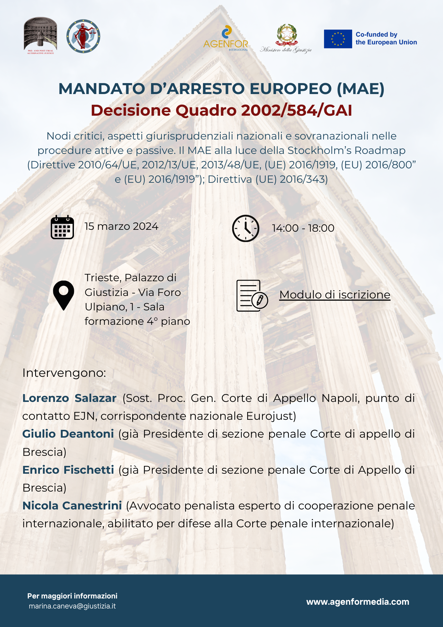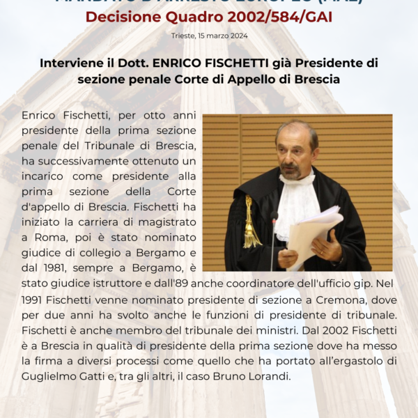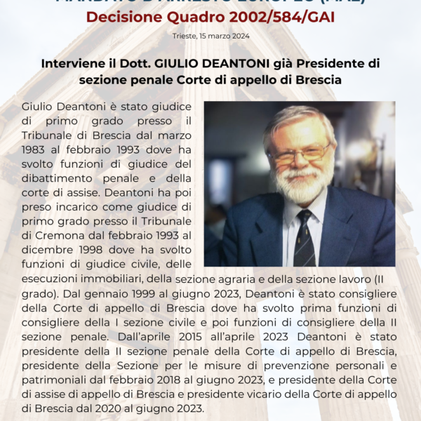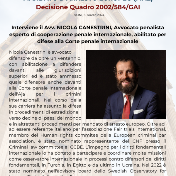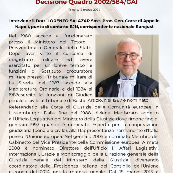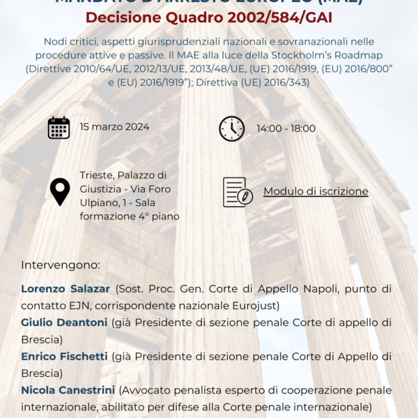 Corso MAE (Mandato di Arresto Europeo) e la Decisione Quadro 2002/584/GAI – Nodi critici, aspetti giurisprudenziali nazionali e sovranazionali nelle procedure attive e passive. Il MAE alla luce della Stockholm’s Roadmap (Direttive 2010/64/UE, 2012/13/UE, 2013/48/UE, (UE) 2016/1919, (EU) 2016/800” e (EU) 2016/1919”); Direttiva (UE) 2016/343).